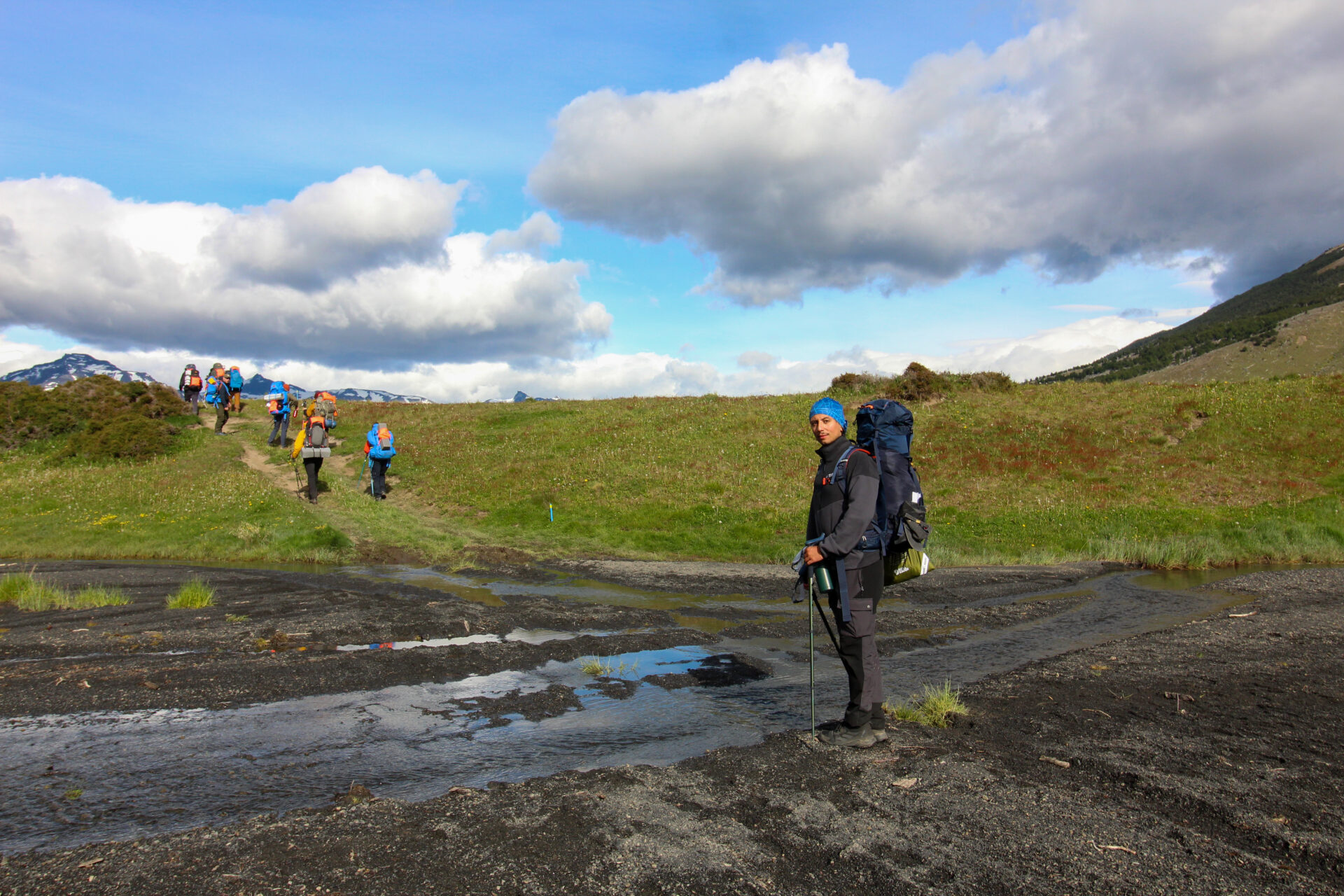A la mañana siguiente, muy temprano —a las siete en punto— partimos rumbo a la línea de salida. El cielo estaba gris, con esa amenaza constante de lluvia tan propia de la Patagonia, aunque finalmente el agua nunca cayó. No hubo un pistolazo ni una largada ruidosa: solo el corte simbólico de una cinta y la salida pausada de los excursionistas, en pequeños grupos de tres o cuatro personas. Tras pesar las mochilas —la mía rondaba los 15 kilos, comida incluida— y tomarnos la foto grupal, comenzamos a caminar. Las primeras horas fueron amables, aunque bastó media hora para que el cuerpo empezara a sentir el peso real del desafío.