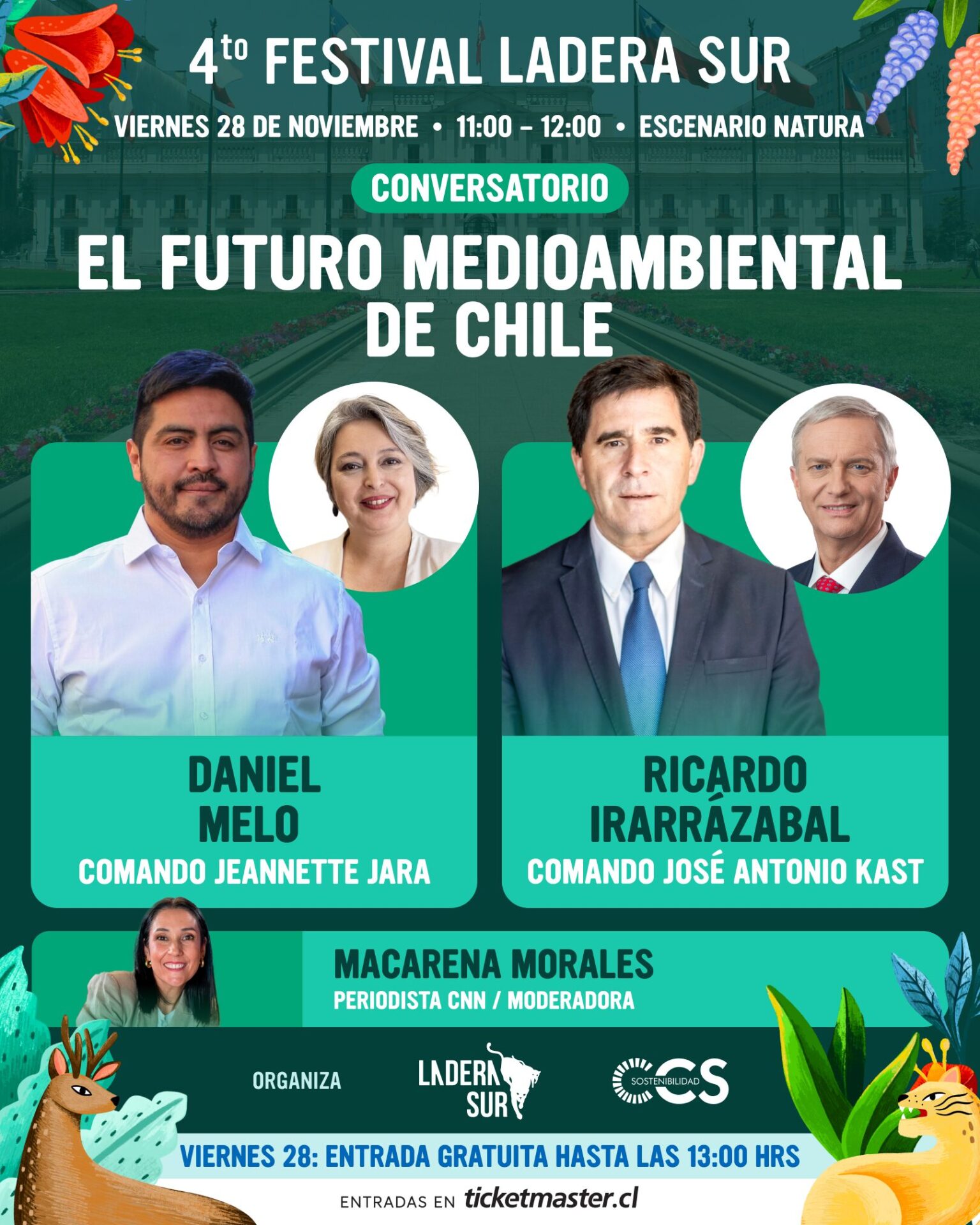 El Festival Ladera Sur abrirá el espacio para los comandos de los candidatos presidenciales José Antonio Kast y Jeanette Jara para tratar sus propuestas para los desafíos ambientales más importantes del país, invitando al público a informarse y evaluar propuestas de cara a la segunda vuelta de las elecciones presidenciales.
