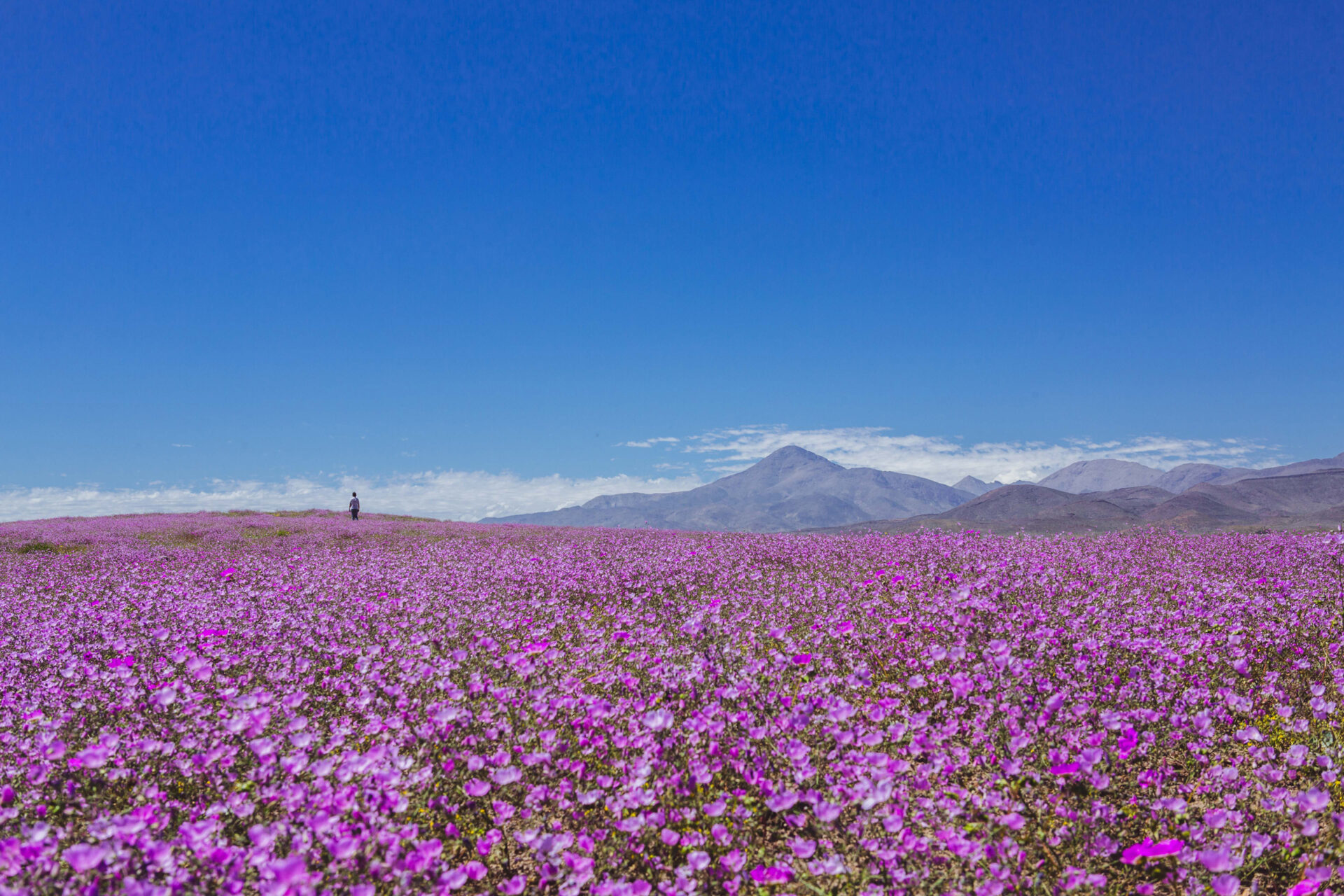 Mantos de flores violetas, amarillas, blancas y azules irrumpen en la tierra árida, revelando un espectáculo inesperado y efímero. Cerca de 200 especies despiertan a la vida, muchas de ellas endémicas, como la garra de león (leontochir ovallei), que se encuentra en peligro crítico de extinción, la delicada pata de guanaco (cistanthe longiscapa), los azulillos (pasithea caerulea), las añañucas (rhodophiala bagnoldii) y los suspiros del mar (nolana paradoxa), cada una adaptada de manera única a la extrema aridez que caracteriza a este territorio.