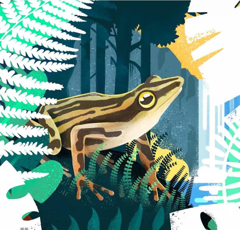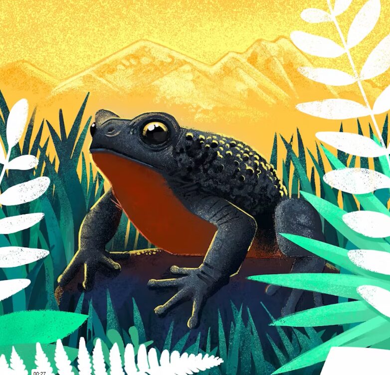 El sapo de nariz larga (Atelopus longirostris) es una especie amenazada que vive en los bosques montañosos y tropicales de los Andes. Se consideraba extinta tras 20 años sin avistamientos, y recientemente ha sido parte de una acción legal contra un proyecto de minería de cobre (Ilustración: Pablo Ruiz Teneb / Dialogue Earth; Audio: Amadeus Plewnia / Centro Jambatu )