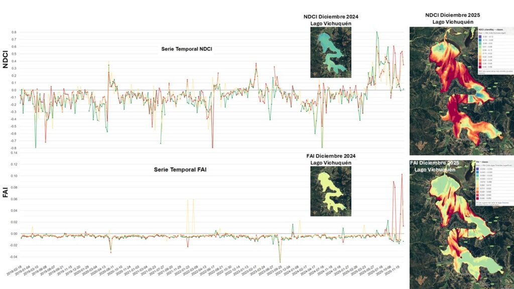 Como una forma de ilustrar el problema, Pablo Sarricolea y Gabriela González Vera, alumna de Magíster en Geografía de la Universidad de Chile, han realizado una evaluación rápida de dos indicadores satelitales clave usando imágenes del programa Copernicus (Sentinel-2). El NDCI (Índice Normalizado de Clorofila) permite estimar la presencia de clorofila-a, mostrando las condiciones favorables para un bloom; y el FAI (Índice de Algas Flotantes), identifica biomasa de algas en la superficie del lago. Cuando este último aumenta, significa que la floración está plenamente desarrollada y que existe riesgo ambiental y sanitario inmediato.