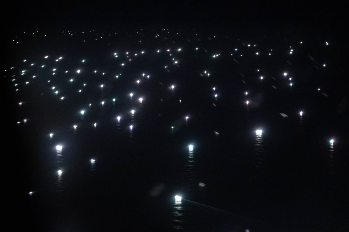 Cientos de barcos poteros acumulados alrededor de la milla 200 de la costa argentina con las luces encendidas para atraer los calamares. Foto cortesía Franco Fafasuli Infobae