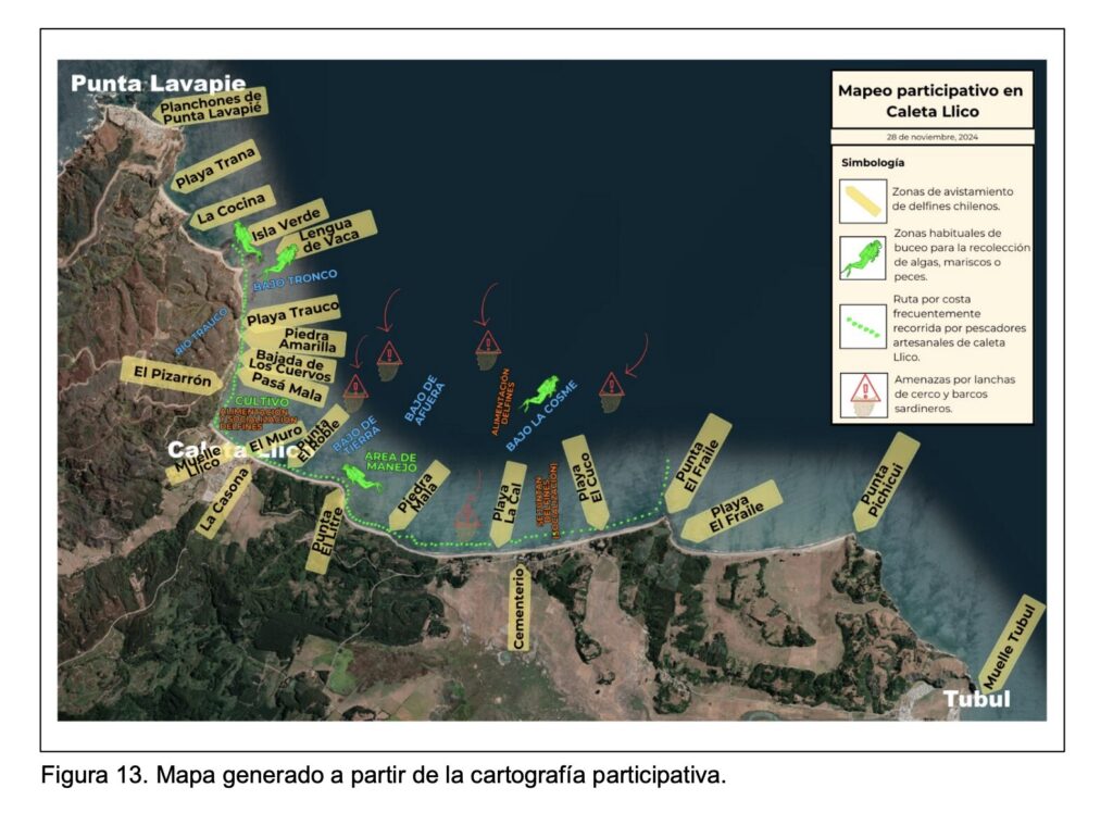 Durante el proceso participaron buzos mariscadores y pescadores artesanales, Recolectoras de orilla, la Junta de Vecinos de Llico, artesanas, emprendedores, niños y niñas de la caleta, quienes compartieron su conocimiento sobre el comportamiento, presencia y amenazas del delfín chileno.