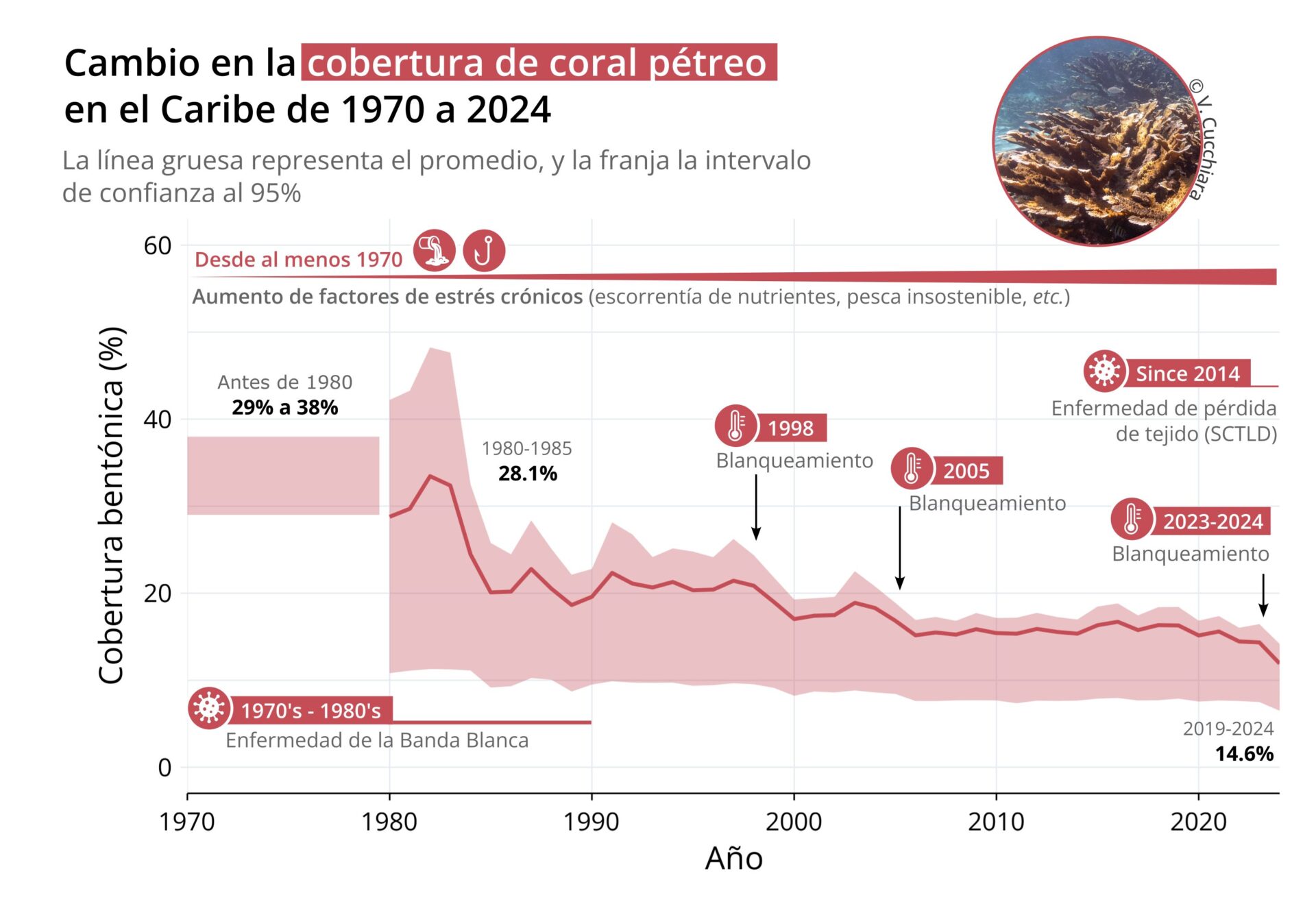 Sin embargo, un reciente informe de la Red Mundial de Vigilancia de los Arrecifes de Coral (GCMRN), una red de la Iniciativa Internacional para los Arrecifes de Coral, entrega cifras a una realidad alarmante: la degradación de cerca de la mitad de los arrecifes de la zona en cerca de 20 años. El trabajo se elaboró en el marco de un enfoque colaborativo en el que participaron más de 200 colaboradores y se estructura en dos partes: una presenta un resumen regional de las tendencias y amenazas que afectan a los arrecifes de coral del Caribe, y la otra detalla 44 análisis a nivel de países y territorios, que incluyen datos ecológicos, estudios de casos y seguimiento socioeconómico, todo ello complementado con anexos y secciones metodológicas.