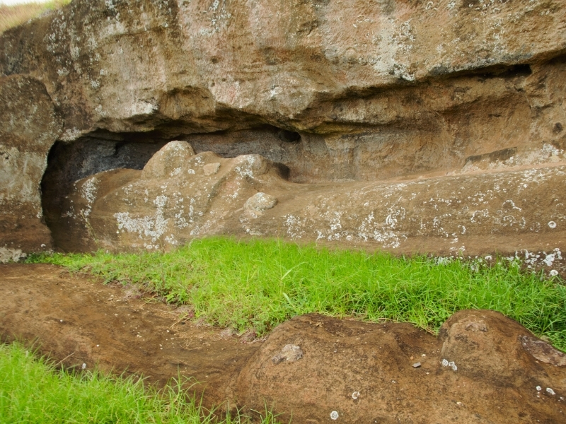 Los escultores trazaban primero la silueta directamente sobre la roca, modelando progresivamente el rostro, el torso y los brazos, mientras la figura permanecía unida al lecho rocoso por una “quilla” dorsal, que le otorgaba estabilidad. Una vez completada la parte frontal, se excavaba cuidadosamente la sección posterior hasta liberar casi por completo la escultura. En ese punto, el moái era separado, deslizado cuesta abajo y colocado en posición vertical para realizar los ajustes finales. Este proceso se sostenía gracias a una compleja organización social, donde cada rol tenía un lugar específico.