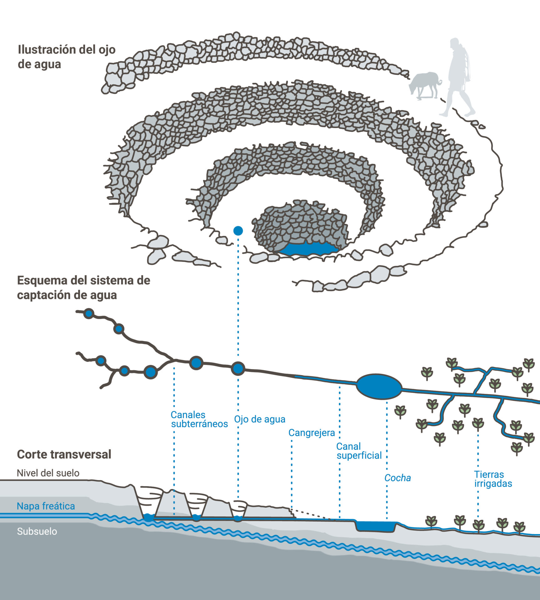 Los puquios, llamados también acueductos subterráneos, son una infraestructura hidráulica horizontal que capta el agua del subsuelo, aprovechando la pendiente natural del valle, para conducirla y distribuirla hacia los campos de cultivo. Se utilizaban dos tecnologías de captación del agua. La primera por medio de los “Ojos de agua”, un tipo de pozos verticales de forma espiral, que crean acceso al agua subterránea desde la superficie y la encauzan a través de canales subterráneos. La otra, se basa en “cangrejeras” que son drenajes construidos por debajo de la superficie que llegan al agua subterránea. En ambos casos, el agua del subsuelo drena hacia un canal superficial, principal y abierto que luego desemboca a una reserva de agua o cocha, desde donde se distribuye el agua a los campos agrícolas.
