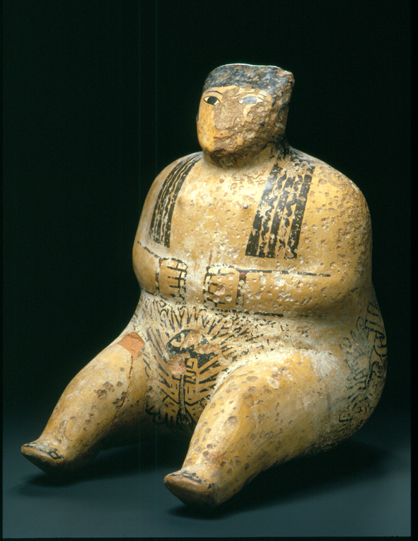 En las fases tempranas de la cultura Nasca, la imagen femenina estuvo ausente en la cerámica. En la siguiente fase, denominada Nasca Medio —período en el que se registraron dos momentos de sequía— comenzaron a aparecer en cerámicas imágenes femeninas modeladas o pintadas, que a partir de entonces se convirtieron en un tema ampliamente representado[10]. Una convención recurrente para modelar en la cerámica a una o varias divinidades femeninas consiste en la figura de una mujer desnuda, cuyo cuerpo robusto está pintado de blanco o crema y decorado con imágenes en negro que posiblemente aluden a tatuajes. Esta decoración se concentra especialmente en el área púbica y en las nalgas.