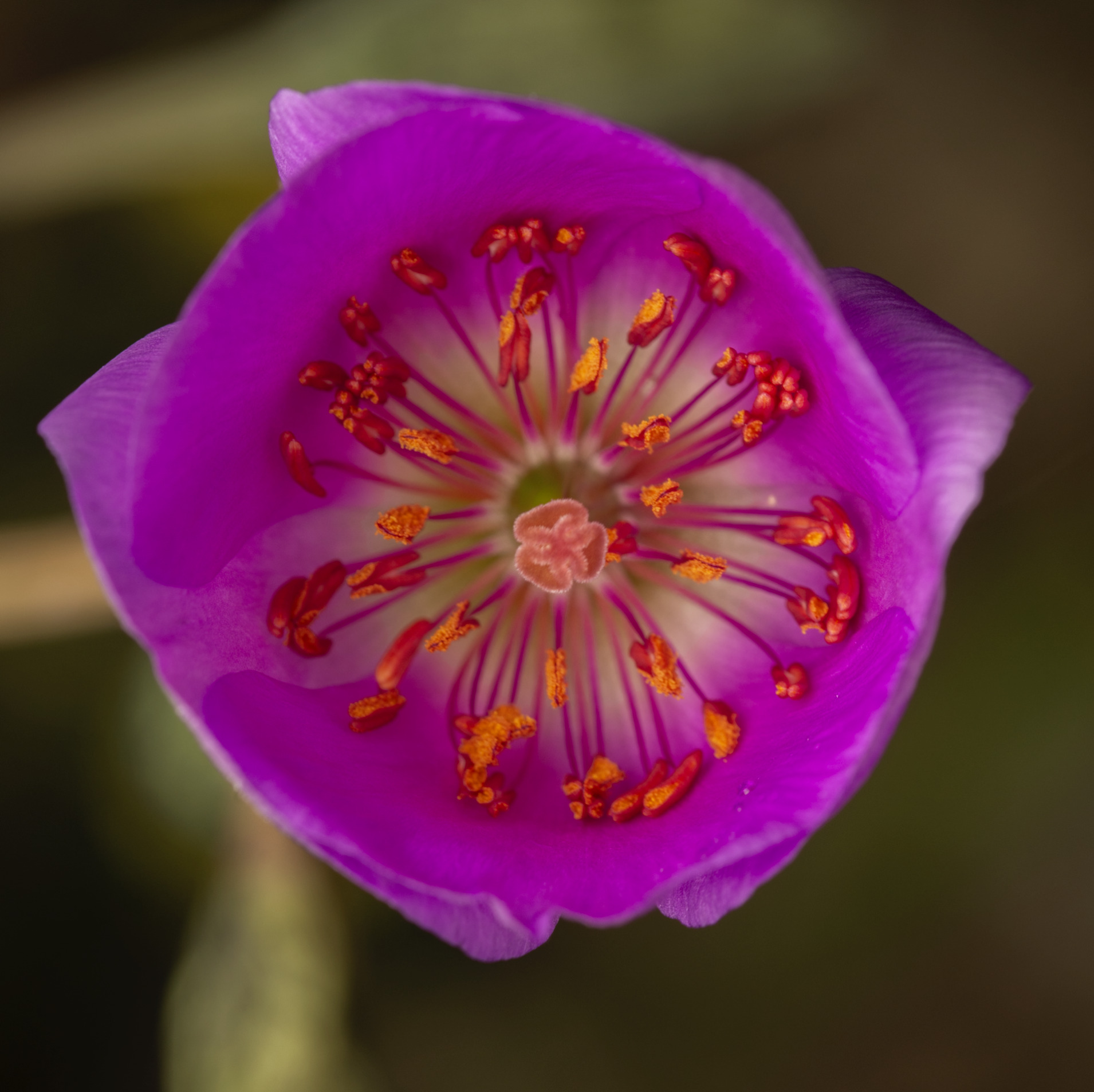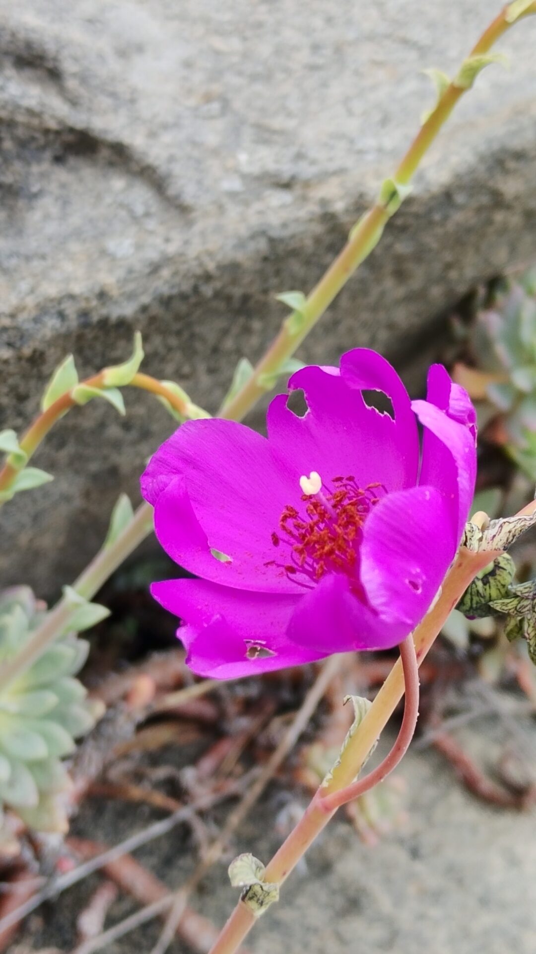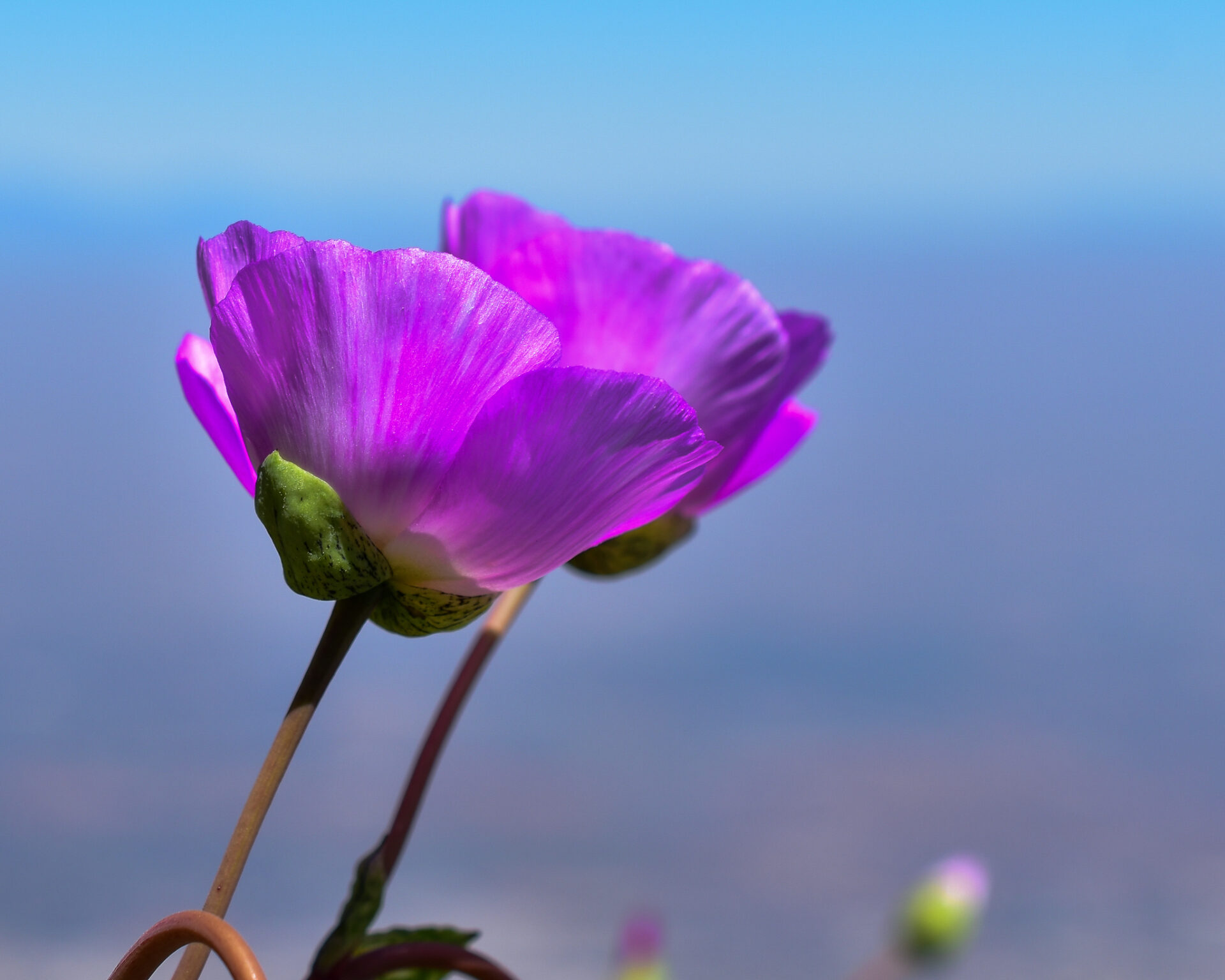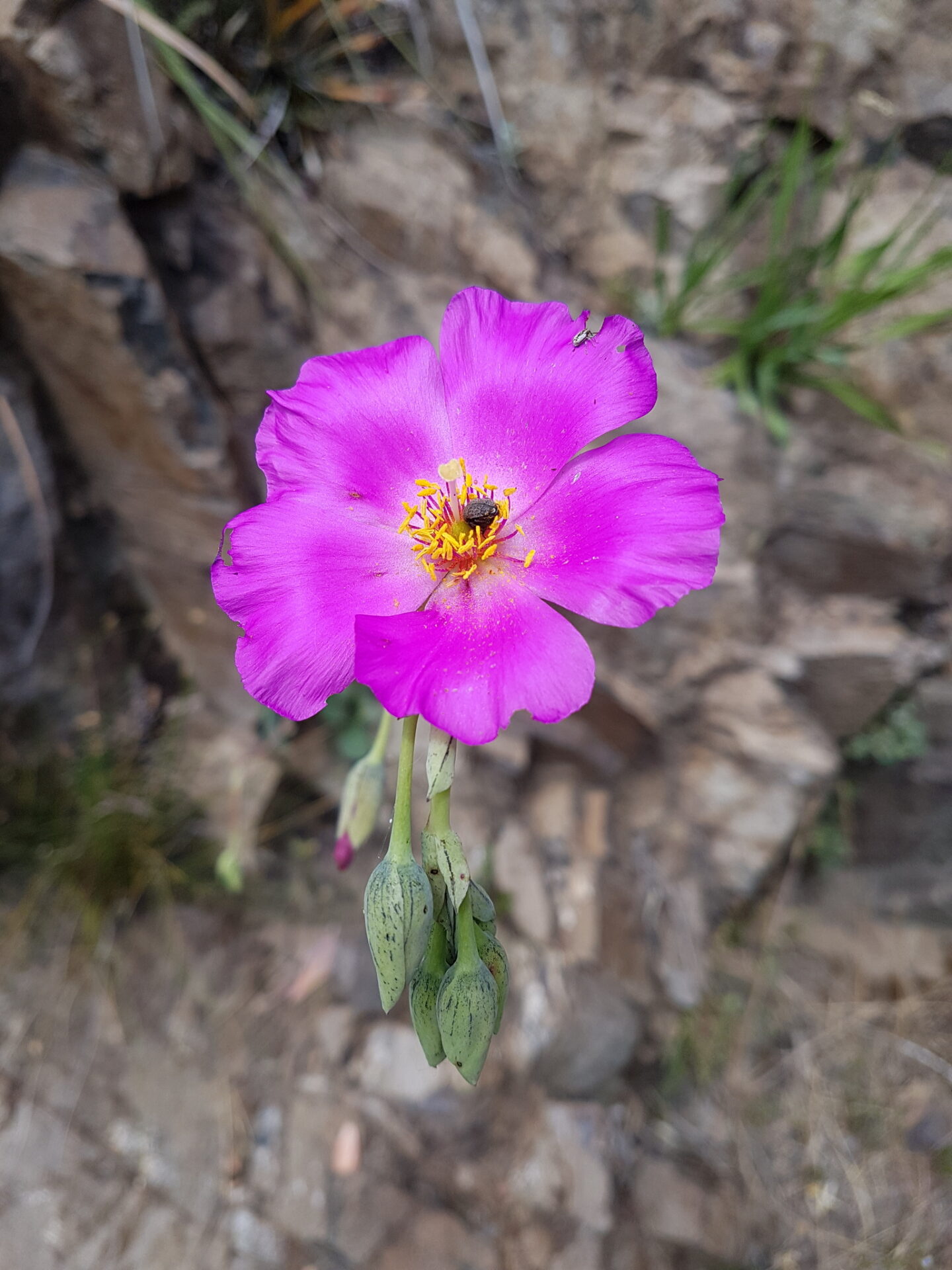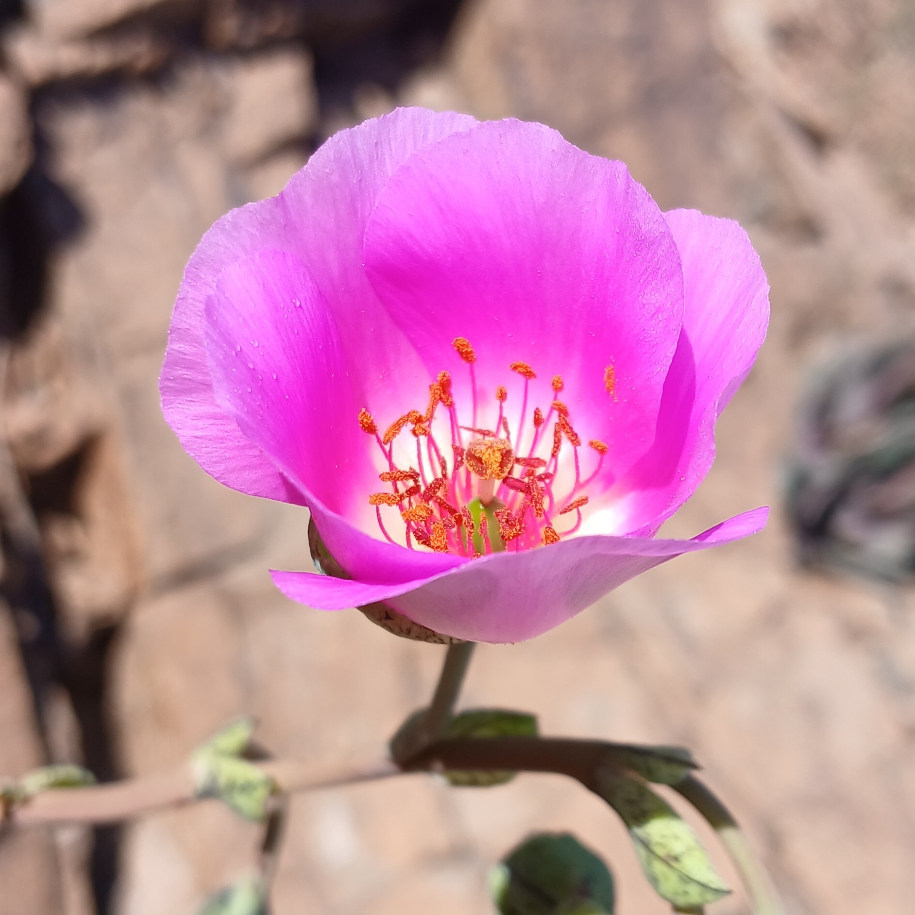 También conocida como calandria, la pata de guanaco es una hermosa hierba perenne de la familia Portulacaceae, que crece en laderas abiertas o entre matorral esclerófilo, desde la precordillera hasta la costa. Elegante y altiva, con su cuello largo y esbelto, esta flor -de mata redondeada y prolija de hojas suculentas grisáceas o glaucas – se imponte como la verdadera reina del desierto, un símbolo de vida que desafía la aridez y colorea los paisajes más inhóspitos.