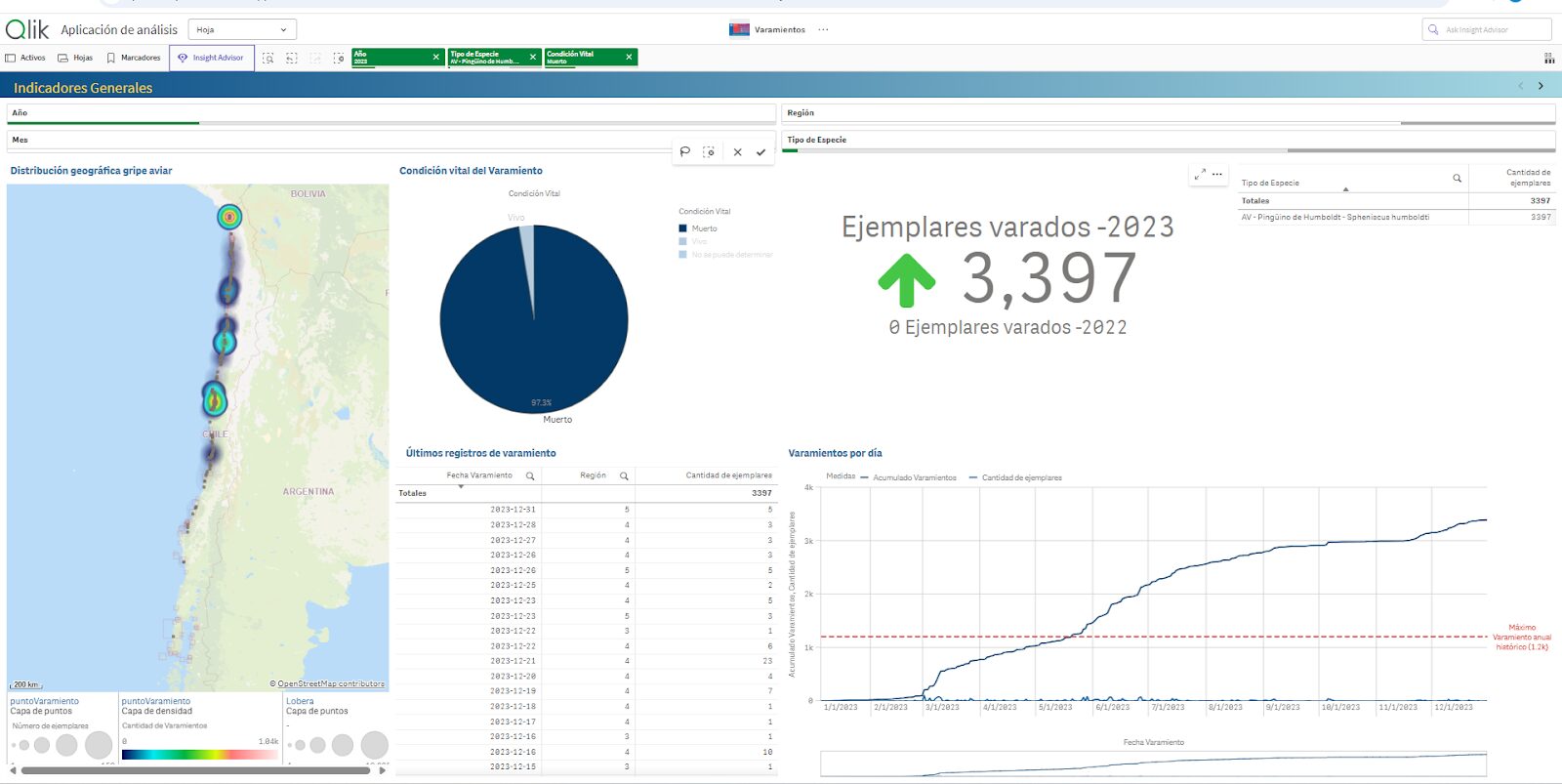 Los datos de animales varados el 2023 recolectados por SERNAPESCA tienen probablemente un cruce entre individuos muertos por influenza aviar, por hambre debido al Fenómeno del Niño y por captura incidental en redes de enmalle. Aún existen muchos elementos que necesitan ser estudiados y sistematizados, y son parte de los elementos claves que estamos trabajando actualmente.
