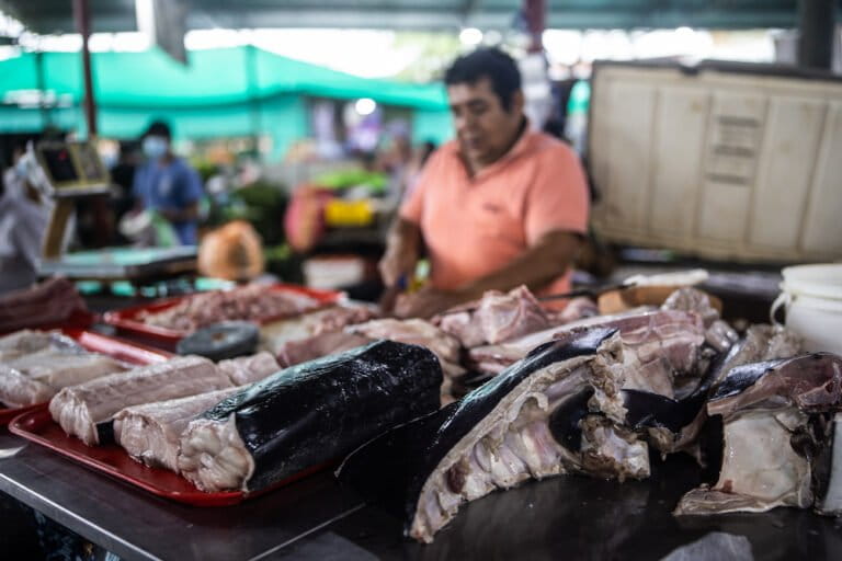 En Perú, la pesca y comercialización de tiburones está permitida. De hecho, es una de las carnes más consumidas por los peruanos. “Comemos tiburón. Es una de las carnes más baratas y de fácil acceso en el mercado, particularmente las especies oceánicas como el tiburón azul. Un kilo de tiburón está a seis o siete soles en el mercado. Comparado con el pollo u otras proteínas es de fácil acceso”, explica Juan Carlos Rivero, director científico de Oceana.