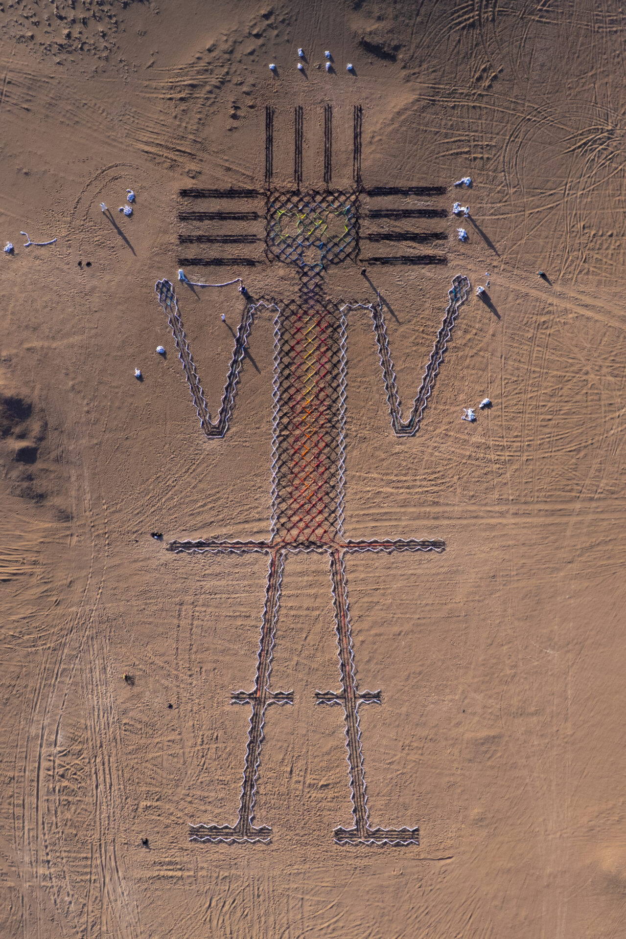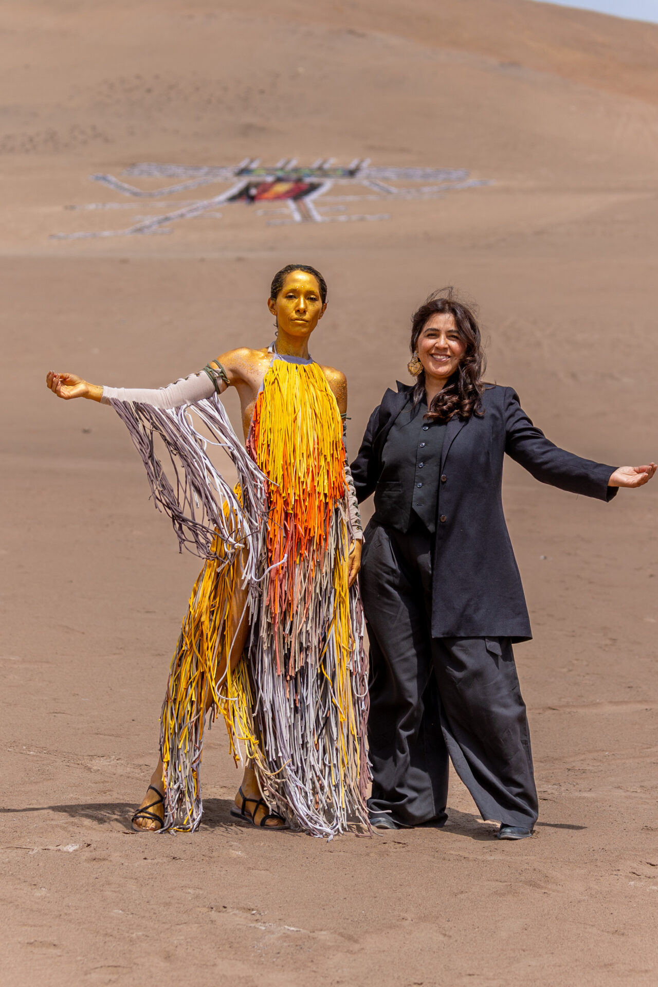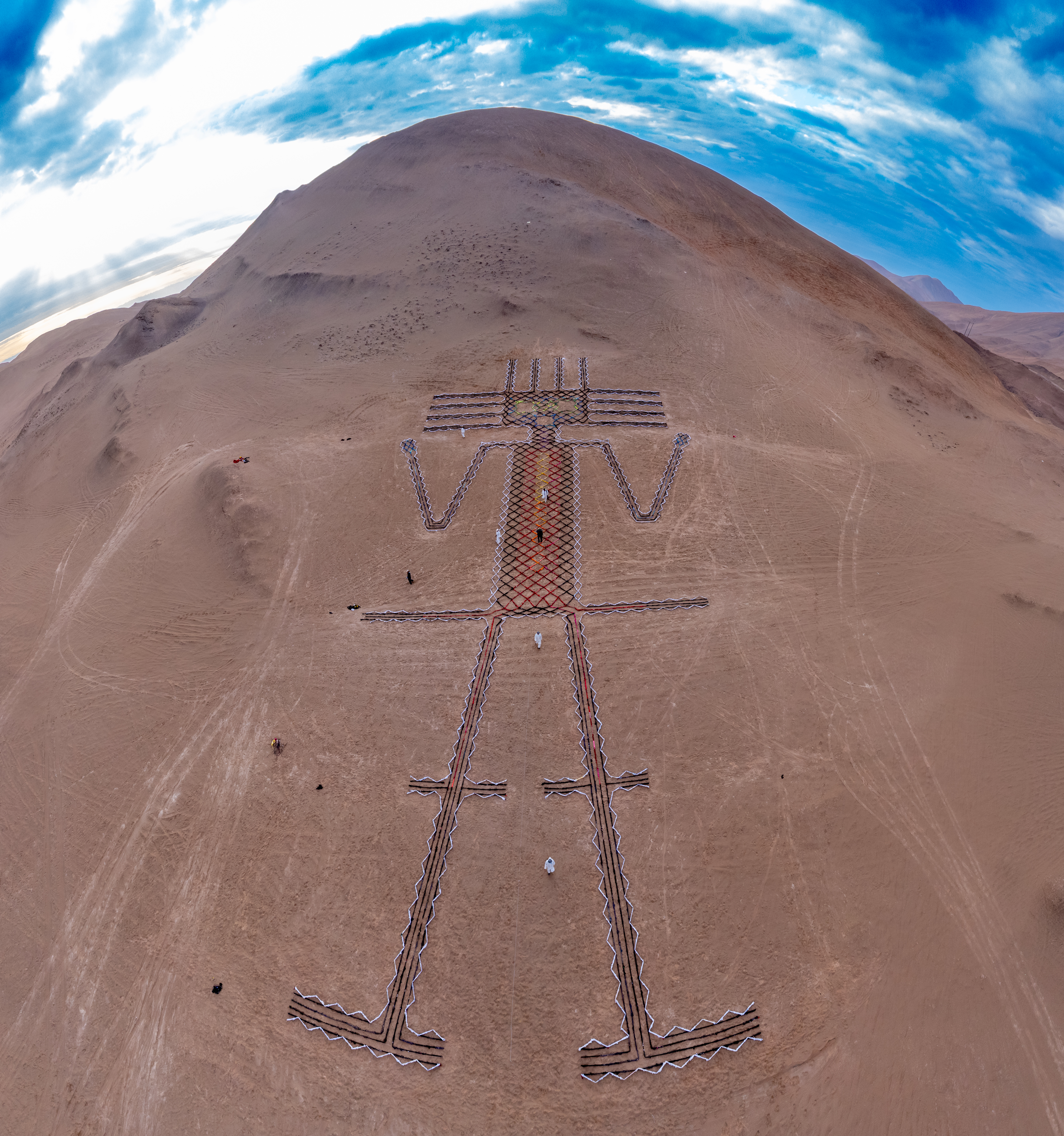 El Gigante Vestido fue trazado y montado a partir de aproximadamente 5.500 prendas de vestir provenientes del vertedero textil de Alto Hospicio, utilizadas bajo un marco de control, custodia y trazabilidad del proyecto. La instalación alcanza una extensión aproximada de 86 metros y recrea al Gigante de Tarapacá, el petroglifo antropomórfico más grande del mundo.