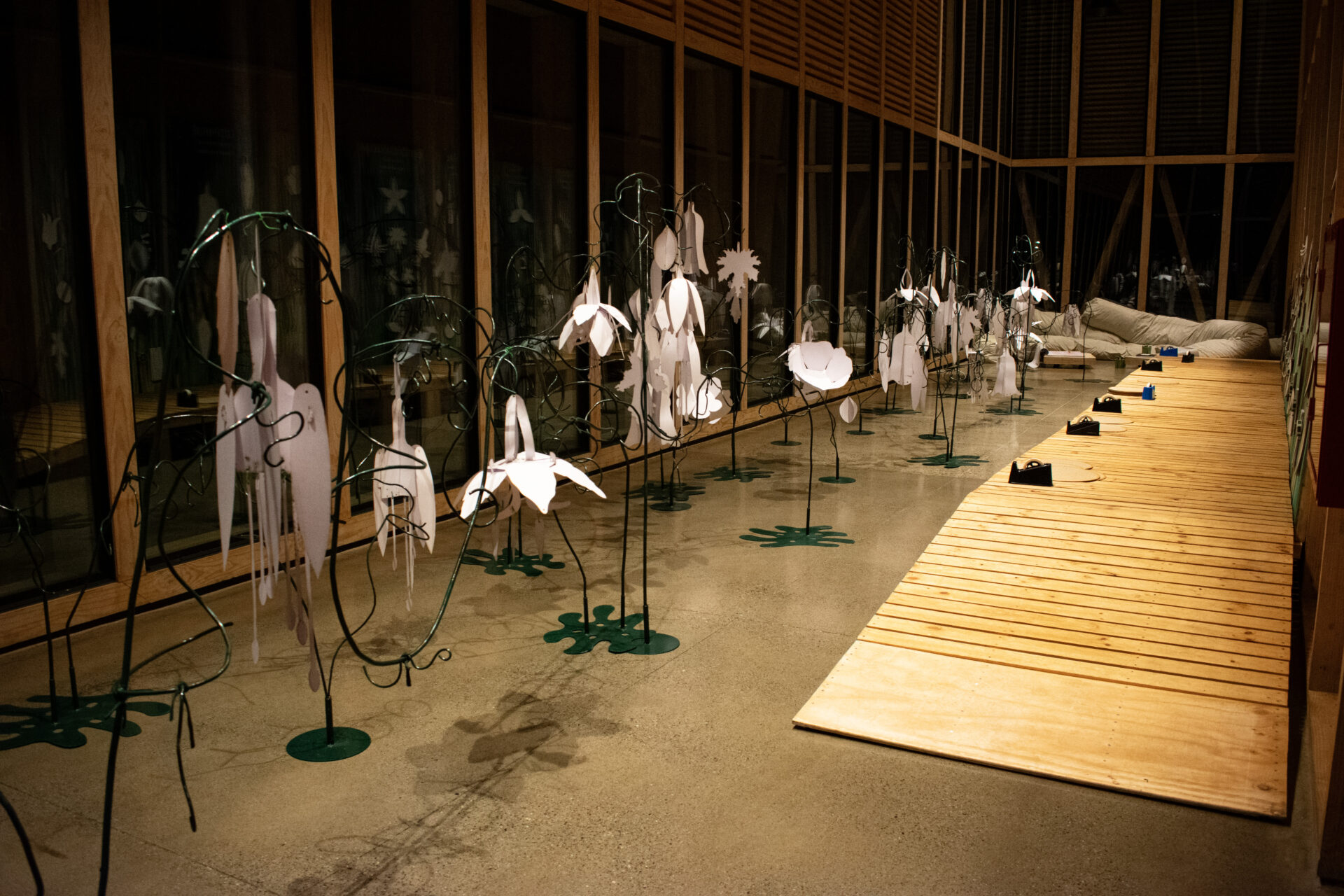 Una vez creada la flor, los participantes deben buscar su lugar en las estructuras de fierro que evocan tallos, ramas y raíces aéreas desplegadas por todo el espacio. El gesto individual se disuelve entonces en una enredadera colectiva: la flor propia adquiere sentido al entrelazarse con las de los demás, poblando un jardín de gran escala que crece con el tiempo. El recorrido culmina frente a la vista del lago; tras haber habitado el enredo corporalmente, se invita al visitante a registrar y dibujar sus propios enredos florales, decantando la experiencia de saberse parte de una trama donde cada contacto físico es condición para existir.