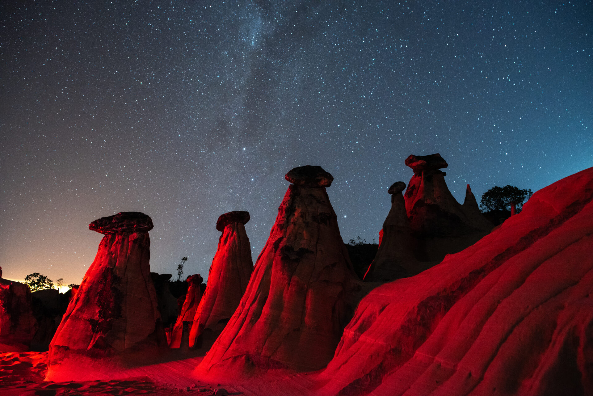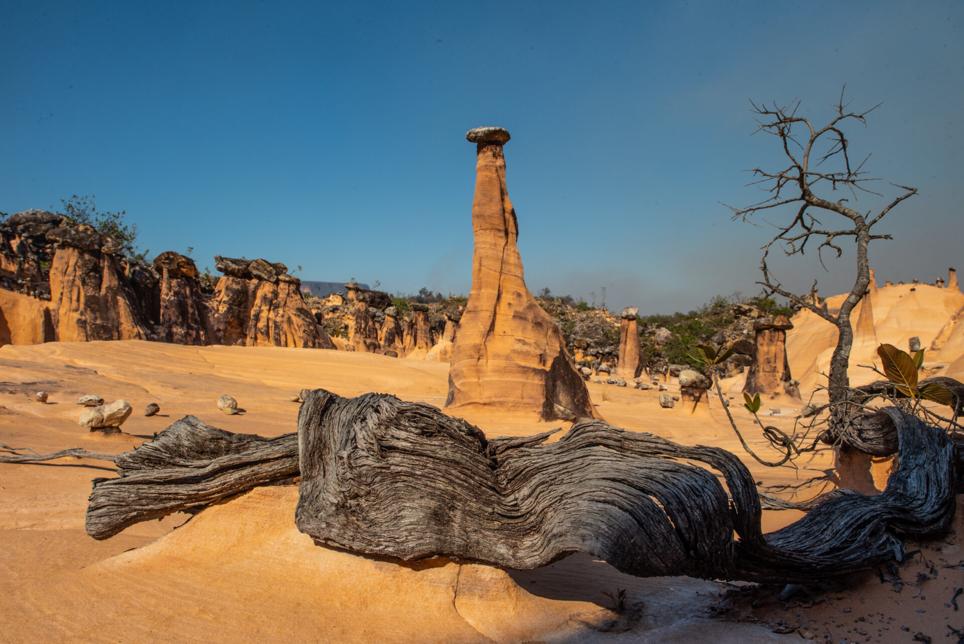 A simple vista, las “chimeneas de hadas” parecen esculturas talladas por un artista. Sin embargo, estas columnas delgadas, coronadas por un bloque de piedra que parece desafiar la gravedad, son en realidad obras de la naturaleza. A veces se agrupan en pequeñas colonias, alineadas como guardianas del desierto; otras, se alzan solitarias en el horizonte, proyectando largas sombras que cambian con la luz del día.