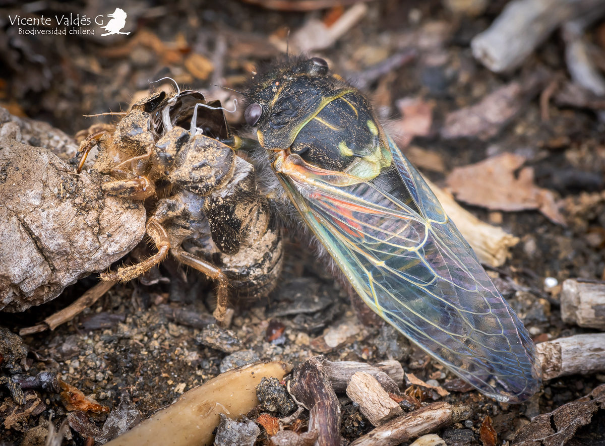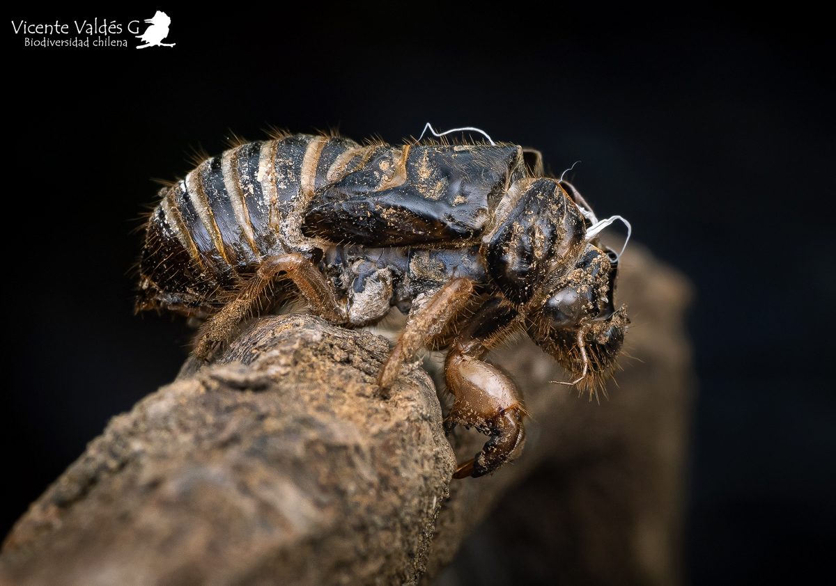 Casi como si tuvieran una guitarra en la espalda y un interminable canto, en Chile se representan en cinco géneros y 35 especies. Pertenencen al orden de los hemípteros y la familia Cicadidae, formando parte de un universo que se empezó a descubrir hace muy pocos años en Chile.