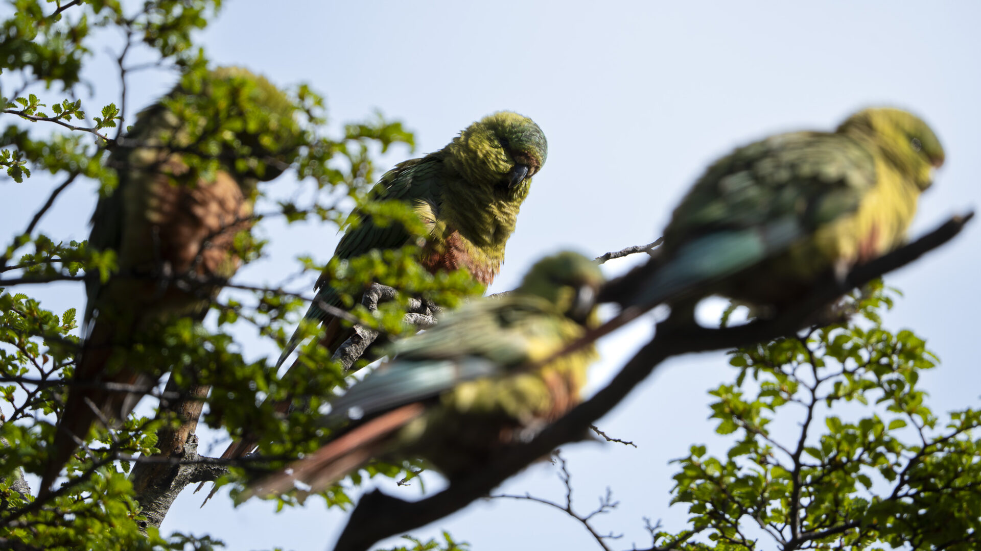 Pero los grandes mamíferos no fueron los únicos protagonistas de la jornada. Nuestro viaje nos llevó frente al lago Pehoé, donde entre estruendos y rayos de sol un grupo de ocho cachañas –loro más austral del mundo– nos dieron la bienvenida.