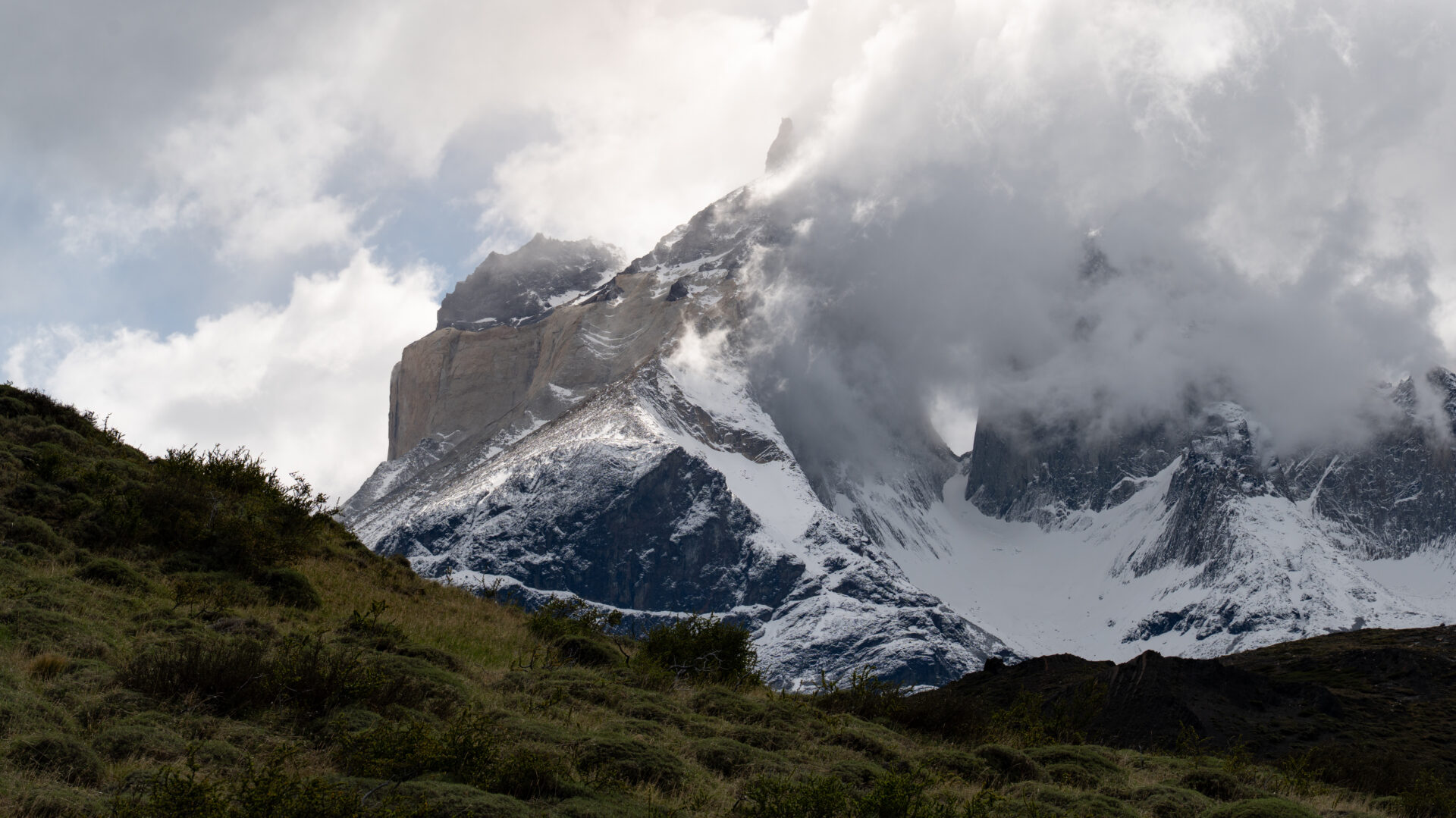 Mientras nos tomábamos nuestro tiempo para practicar los encuadres y la composición en nuestras fotografías con las diferentes aves de modelos, un gigante hizo su aparición. Con cumbres de granito y roca sedimentaria moldeada por la erosión glaciar, los Cuernos del Paine se dejan ver por primera vez frente a nuestros ojos.