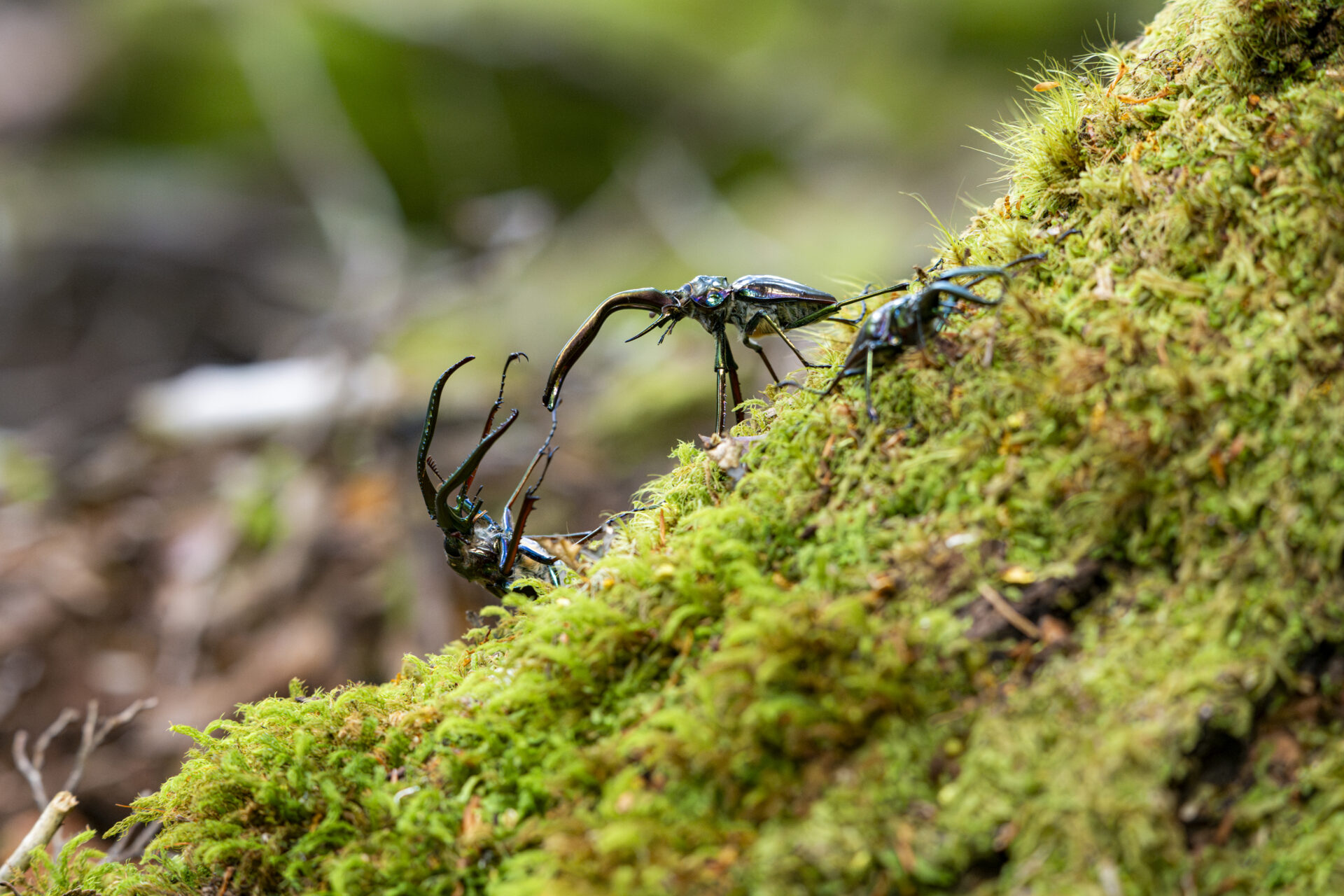Sobre los 10 metros de un coihue, un verdadero espectáculo de la naturaleza toma todo el protagonismo. Como cada verano, en plena temporada de apareamiento, los ciervos volantes macho entran en modo pelea. Con sus grandes mandíbulas, que incluso pueden superar el largo de su cuerpo, pelean entre ellos. Se agarran y compiten hasta que uno cae árbol abajo. El ganador es el que se podrá reproducir. La hembra, mientras tanto, sube el árbol a su propio ritmo y espera. De mandíbula más pequeña, es quien luego deposita los huevos en la hojarasca del bosque.