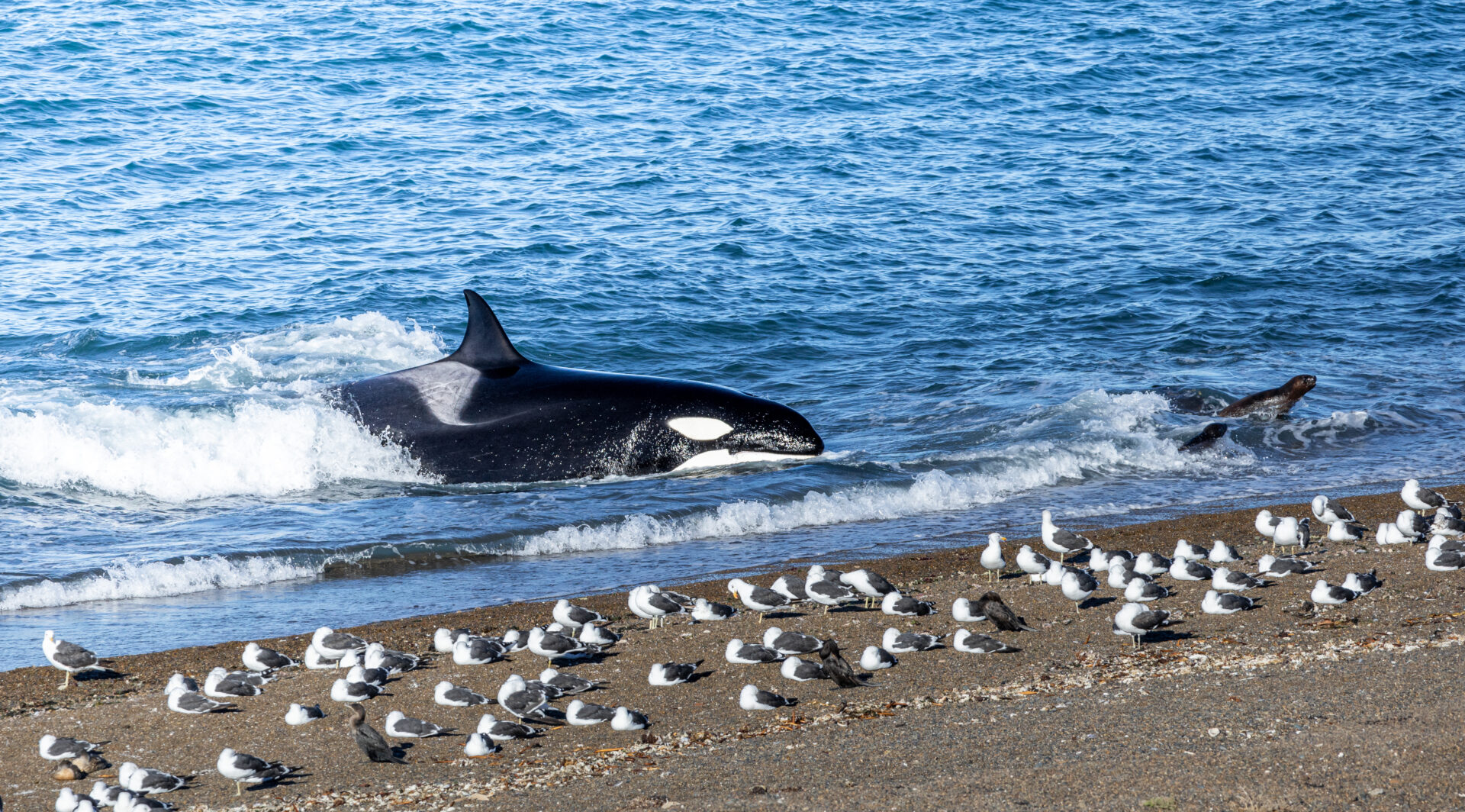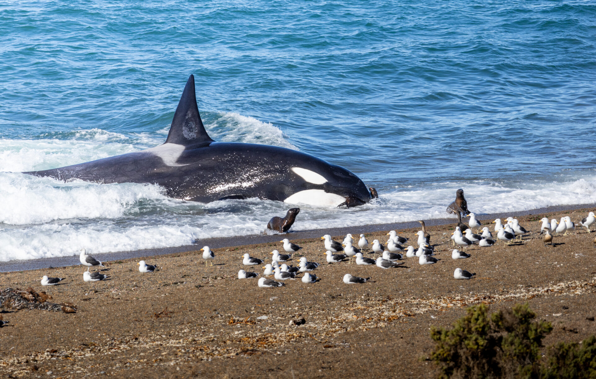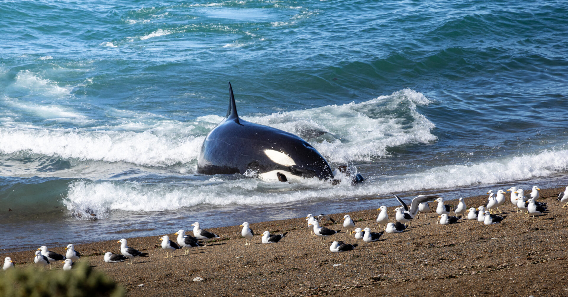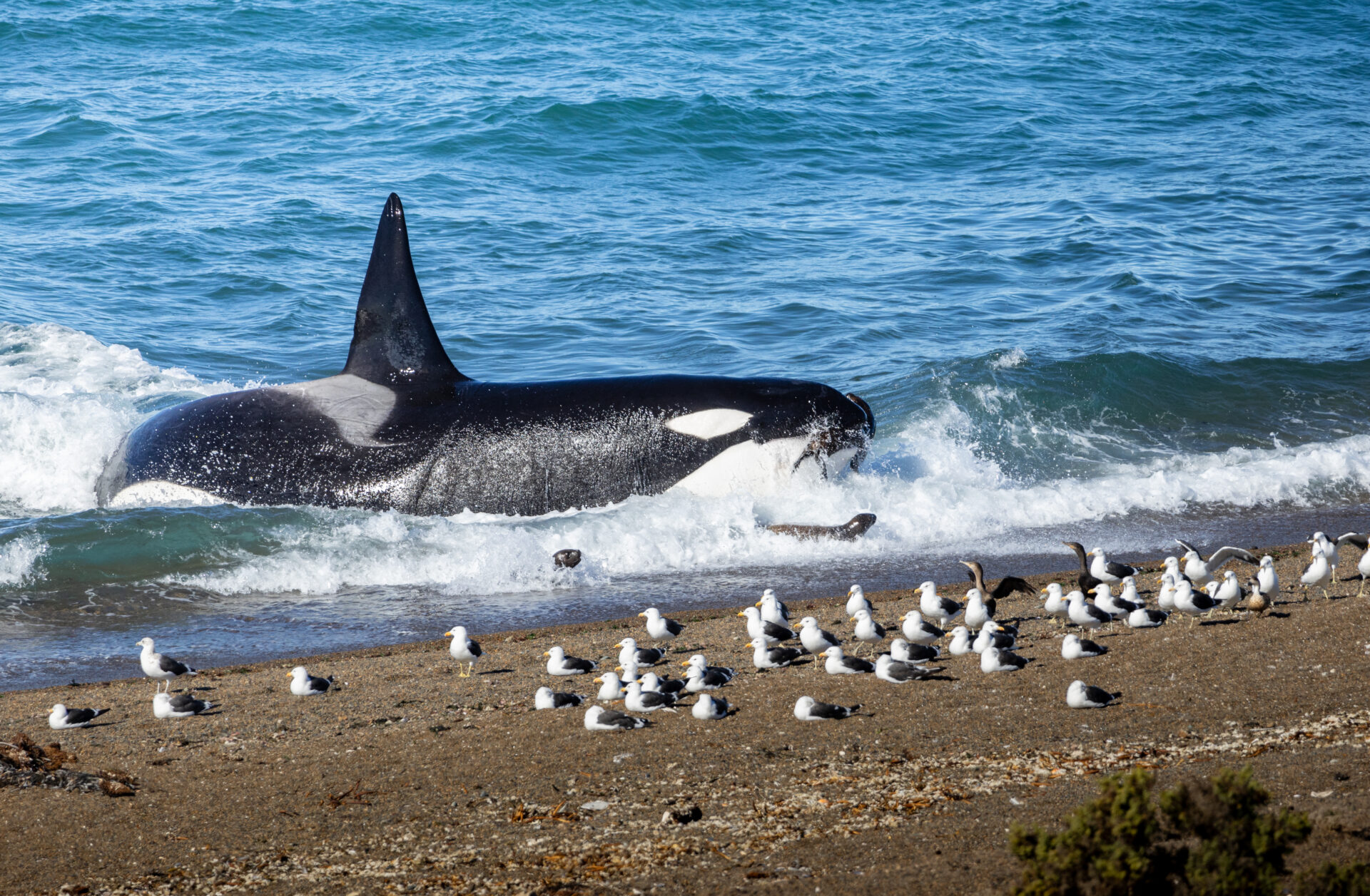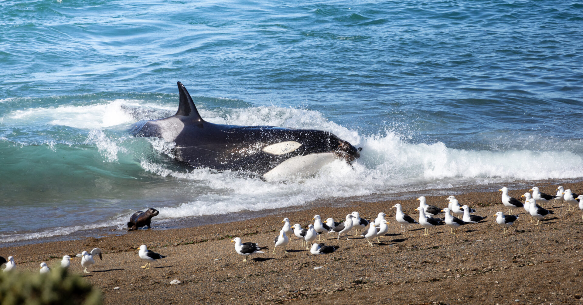 En la tarde del 26 de marzo se vio una de las versiones más arriesgadas de la depredación en la naturaleza en el sur de Argentina. Dos orcas, superdepredadores marinos considerados de los animales más inteligentes y adaptables del reino animal, lanzaron su cuerpo —que mide entre seis y ocho metros de largo, con 4 a 5,5 toneladas de peso— como un torpedo a la arena fría de la playa para alimentarse. A eso se le conoce como un varamiento intencional. Su plato del día eran pequeños lobos marinos.