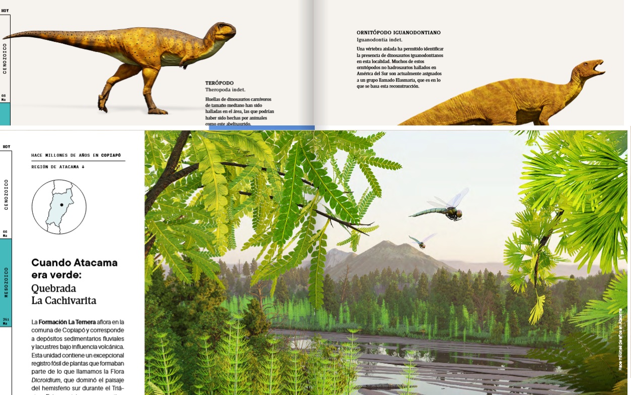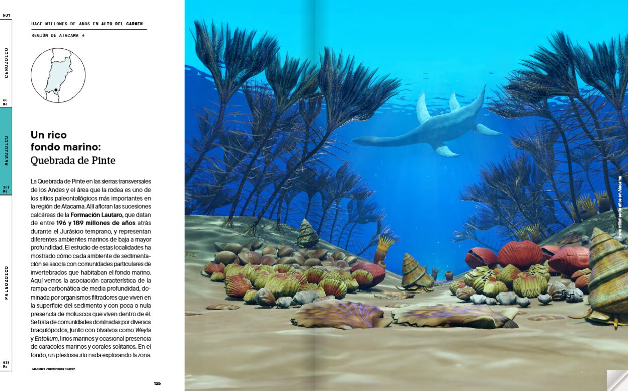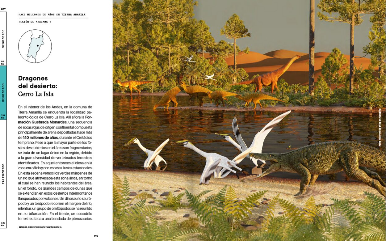 Ese vacío es el que viene a llenar “Hace millones de años en Atacama”, una obra colectiva impulsada por la Corporación para la Investigación y Avance de la Paleontología e Historia Natural de Atacama (CIAHN), que propone algo inédito: reconstruir la prehistoria completa de una región chilena, integrando geología, paleontología y paisaje, desde el Paleozoico (que se remonta a unos 538 años antes del presente) hasta los tiempos recientes.