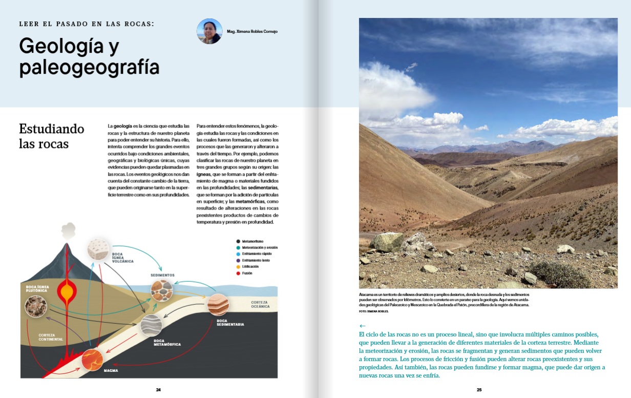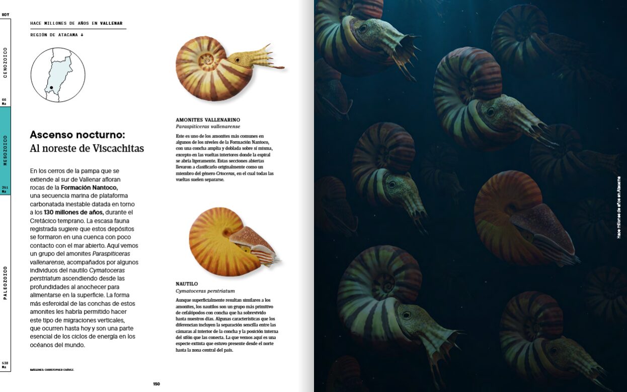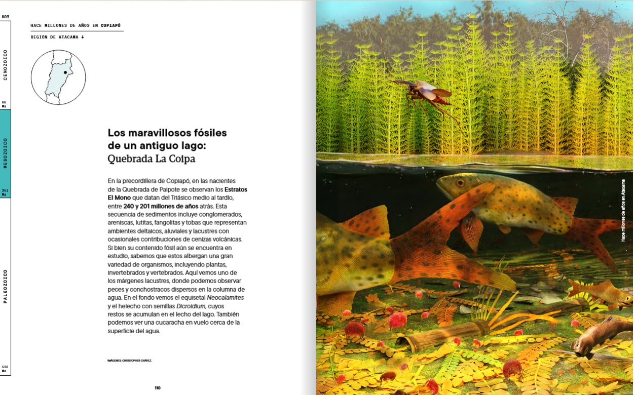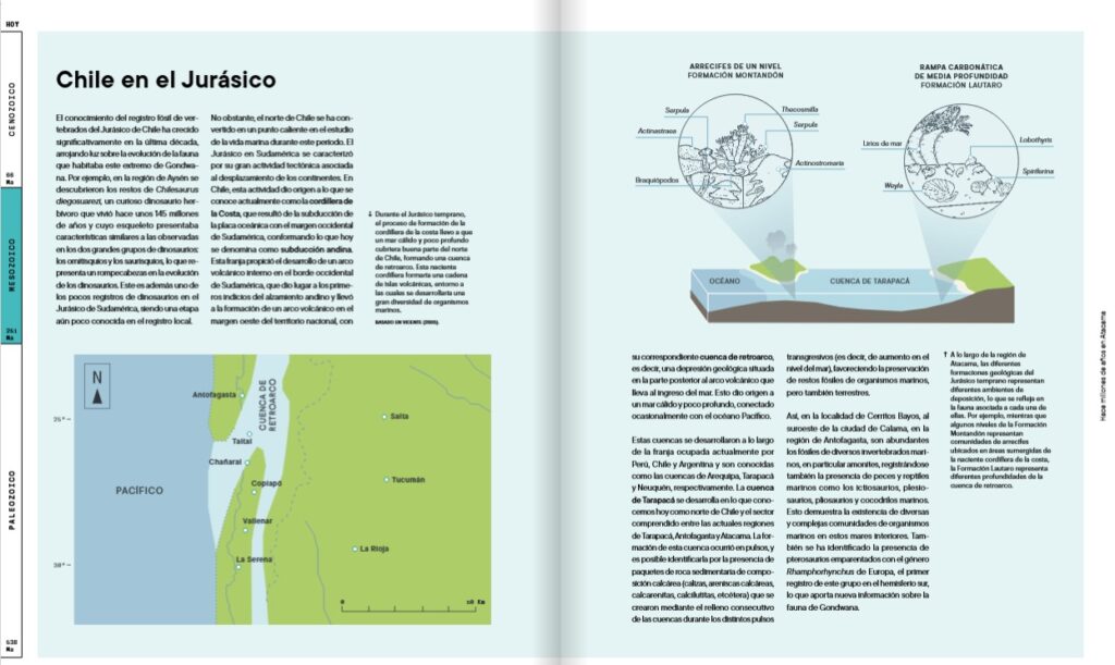 Ese vacío es el que viene a llenar “Hace millones de años en Atacama”, una obra colectiva impulsada por la Corporación para la Investigación y Avance de la Paleontología e Historia Natural de Atacama (CIAHN), que propone algo inédito: reconstruir la prehistoria completa de una región chilena, integrando geología, paleontología y paisaje, desde el Paleozoico (que se remonta a unos 538 años antes del presente) hasta los tiempos recientes.